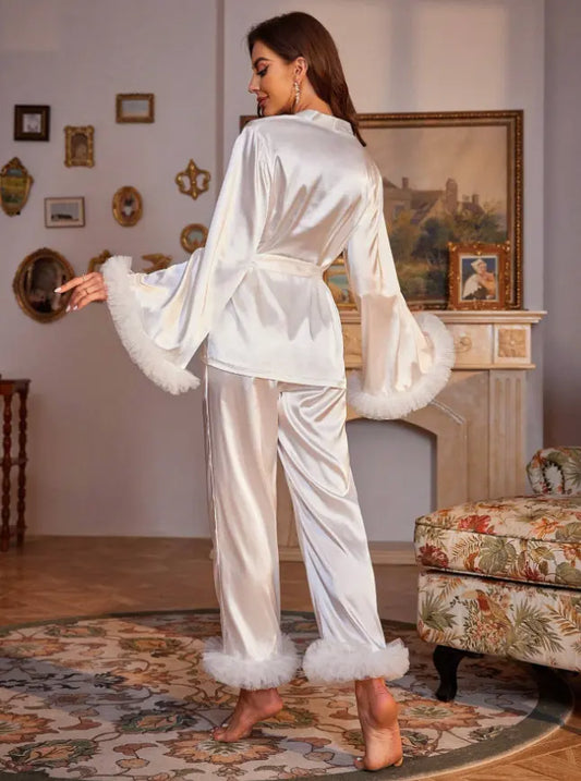 Women's White Satin Pajama Set – Luxury Mesh Detail, Two-Piece Loungewear